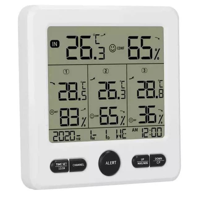 Multifunktionstermometer: En trådlös termometer och hygrometer, som mäter temperaturen inomhus och utomhus och som även mäter luftfuktigheten. Med 3 st sensorer.