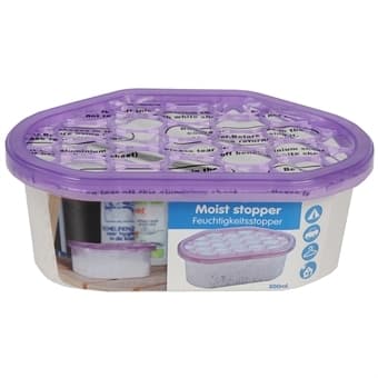 Affugter med små granulater som beskytter vægge, møbler, biler og tekstiler mod fugt, mug og dårlig lugt. Granulaterne er klar til at blive brugt.