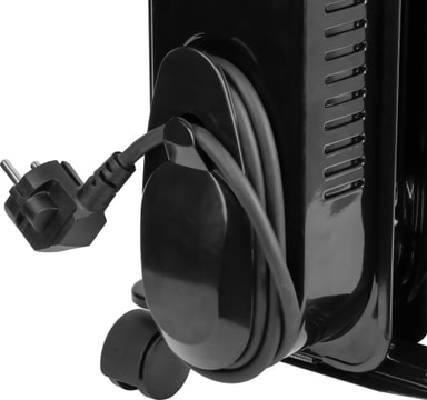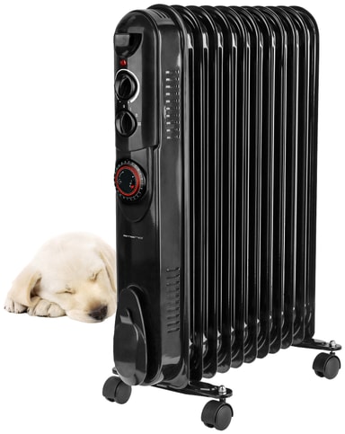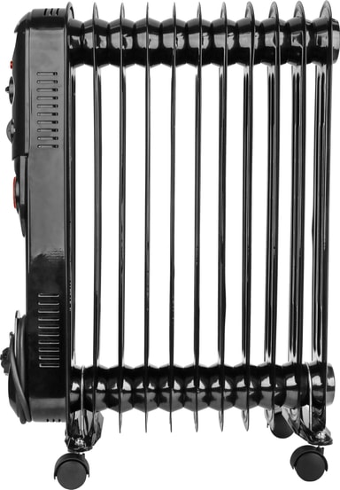 Den kompakte fritstående varmer har en metalpanel på forsiden og en 11-finnet varmeflade. Den har hjul underneden for nem flytbarhed.