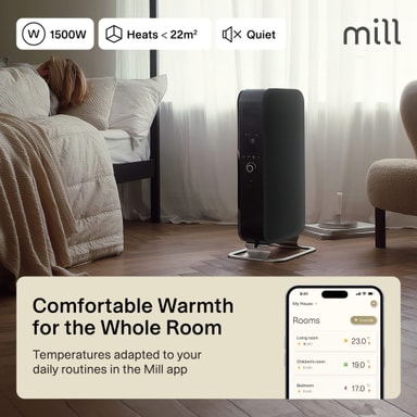 Hold dit hjem hyggeligt med 1500W Mill Gentle Air olievarmeren OIL1500WIFI3. Den er perfekt til rum op til 22 m² og opvarmer effektivt uden at udtørre luften. Brug Mill-appen til automatiske temperaturjusteringer baseret på brug.Læs mere om produktet