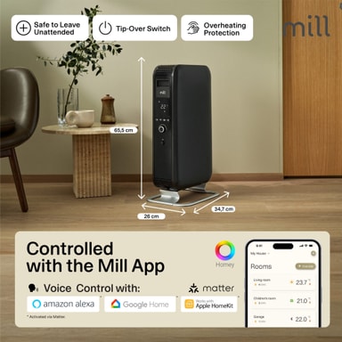 Styr varmeren, uanset hvor du bruger Mill-appen. Appen justerer automatisk temperaturen, så den passer til din daglige rutine. Du kan også styre så mange varmeapparater, som du vil, i flere huse eller hytter og tænde for børnesikkerhed for at holde dine små sikre.
