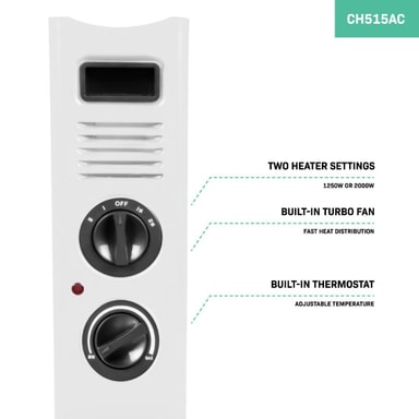 Denne model tilbyder to varmeindstillinger, 1250W eller 2000W. Så du har fuld kontrol over varmelegemets intensitet. Brug den indbyggede termostat til at indstille den ønskede temperatur. Den indbyggede turboventilator giver en superhurtig varmefordeling. Turbo Fan kan naturligvis slukkes, når du foretrækker fuldstændig stilhed.
