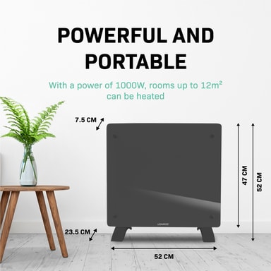 Udgangen på 1000 W leverer nok effekt til at opvarme rum på op til 12 m2. De praktiske dimensioner (52 x 47 cm) gør denne enhed let flytbar, så du kan opvarme ethvert ønsket rum på ingen tid. Det er perfekt, når du arbejder hjemmefra og ikke ønsker at holde centralvarmen i gang hele dagen.