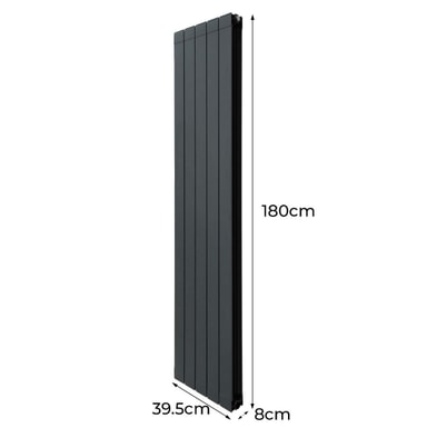 Med en slank antracitfinish fungerer disse radiatorer som et slående fokuspunkt, der forbedrer stemningen i ethvert rum med deres dristige tilstedeværelse. Deres appel går ud over æstetik, da de er omhyggeligt konstrueret til optimal ydeevne. Med robuste aluminiumspaneler, der måler 1800 mm x 75 mm, leverer de overlegen varmeydelse med større effektivitet, hvilket sikrer, at din plads forbliver hyggelig og komfortabel.