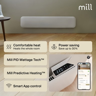 Mill Invisible Smart WiFi Gen4 panelvarmeren PA1050LWIFI4 er kompakt og opvarmer rum op til 17 m². Denne varmelegeme har et elektronisk termostat og er sikker at bruge i våde rum. For forbedret kontrol kan den tilsluttes Mill Wi-Fi appen.Læs mere om produktet