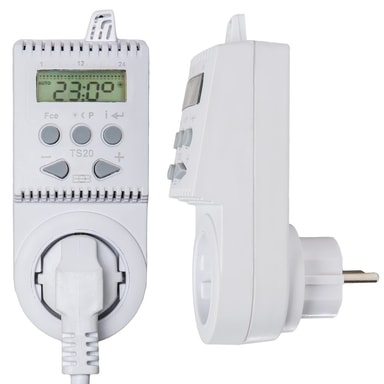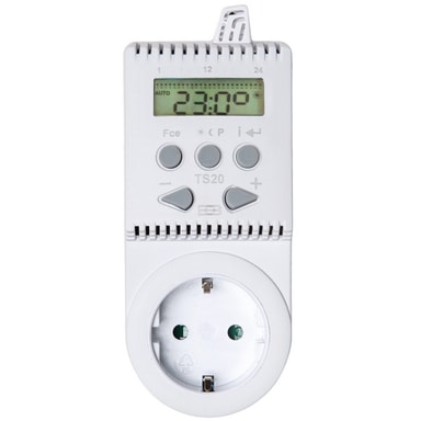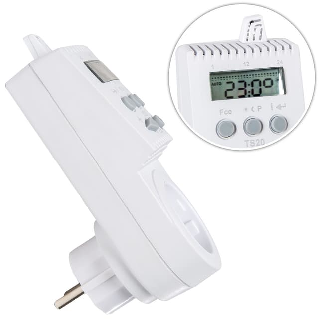 TS20 er en digital temperaturafhængig stikkontakt til automatisk regulering af elektriske varmeanlæg (direkte opvarmning, håndklædetørrer, varmeovne) i huse, lejligheder og kontorer. Den smarte stikkontakt kan indstilles i op til seks tidsintervaller med tre temperaturniveauer for hver dag.