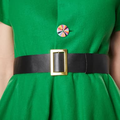 Kvindekostumet, flittig nisse, består af en kjole, en hat, et bælte og knæstrømper. Den korte, grønne kjole af fleecestof har korte ærmer og en elastiklinning på højde med taljen. Kraven og den nederste del af kjolen er holdt i rødt og er forsynet med en gylden pyntebort. Som kontrast sidder der tre kulørte knapper på den øverste del. Begge underskørterne er af hvid satin og sort tyl. Hatten er formet som en nissehue med den typiske, bagudbøjede spids, og med små klokker. Det sorte bælte med det gyldne spænde og det tværstribede knæstrømper afrunder kostumet, materiale: 100 % polyester.