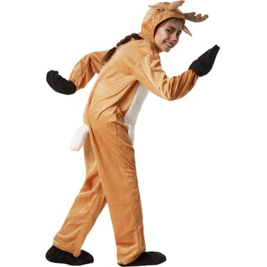 Unisex-heldragt-kostumet, legende rådyr, består af en overall, en hætte, handsker samt sko. Kostumet er fremstillet af okkerfarvet plysstof. Der er påsat hvid kunstpels. Denne overall bliver lukket på bagsiden med en lang lynlås midtpå. Under lynlåsen sidder der en lille hjortehale. Hætten åbnes og lukkes ved halsen med en velcrolukning. Der er påsyet et par ører og gevir. Kostumet komplementeres af de passende handsker og sko af mørk filt med elastikbånd, materiale: 100 % polyester.