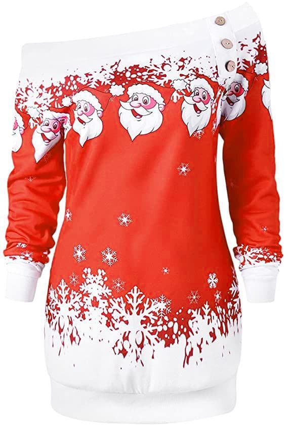 Gør vinteren lidt sjovere med en tyk sweater med julemanden og snefnugmotiver med detaljer som off-shoulder model og træknapper. Den har lange ærmer og holder dig varm hele vinteren.