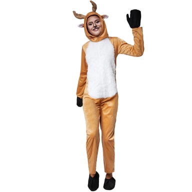 Unisex-kostumet, raskt rensdyr, består af en overall, en hætte, handsker samt sko. Kostumet er fremstillet af okkerfarvet plysstof. Denne overall bliver lukket på bagsiden med en lang lynlås midtpå. Desuden er der påsat hvid kunstpels.Læs mere om produktet