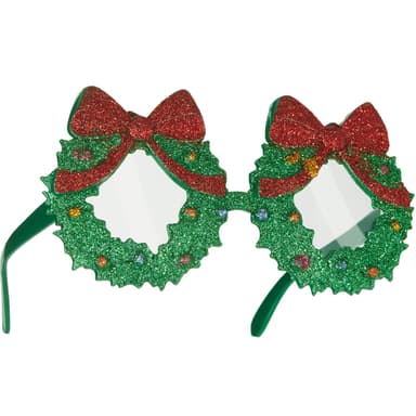 Tilbehør, sjove briller julekrans med sløjfe, består af et bøjeligt stel med plastglas. Rammen glimter og er formet som to grønne julekranse med julekugler og røde sløjfer, materiale: Plast.
