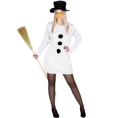 Snedame kostumet består af en kort, flot kjole med påsyet sorte pomponer, som minder om kulknapperne på en vaskeægte snemand. Hertil medfølger en vidunderlig høj hat, og en gulerodsnæse med elastisk, gennemsigtigt bånd. Materiale: 100 % Polyester.