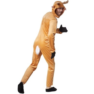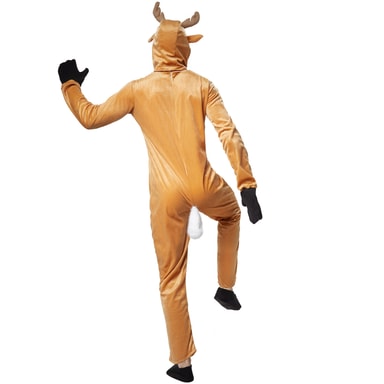 Unisex-kostumet, raskt rensdyr, består af en overall, en hætte, handsker samt sko. Kostumet er fremstillet af okkerfarvet plysstof. Denne overall bliver lukket på bagsiden med en lang lynlås midtpå. Desuden er der påsat hvid kunstpels. Under lynlåsen sidder der en lille hjortehale. Hætten åbnes og lukkes ved halsen med en selvklæbende båndlukning. Der er påsyet et par ører og gevir. Kostumet komplementeres af de passende handsker og sko af mørk filt med elastikbånd, materiale: 100% polyester.