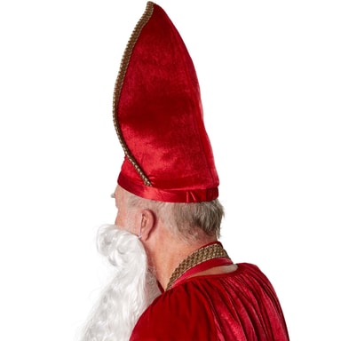 Kostumet St. Nikolaus i strålende mørkerødt er et prægtigt og herskabeligt syn. Den lange frakke til at snøre er af velour og indvendig foret med bronzefarvet satin. Afslutningerne på venstre og højre side bliver fremhævet med en bred, gylden bort.Læs mere om produktet