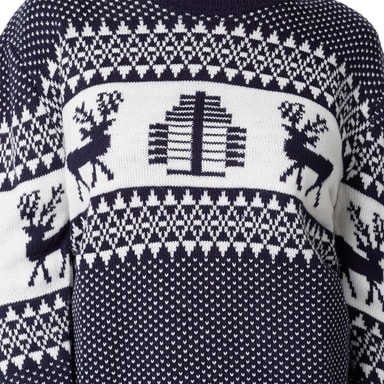 Ved den tofarvede julesweater, Winterwonderland, siger navnet det hele. Det centrale motiv er mødet mellem to hjorte ved et træ i et sneklædt landskab, indrammet af nordiske mønstre og mange små snefnug forneden og foroven.Læs mere om produktet