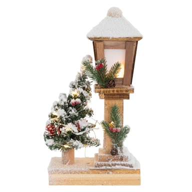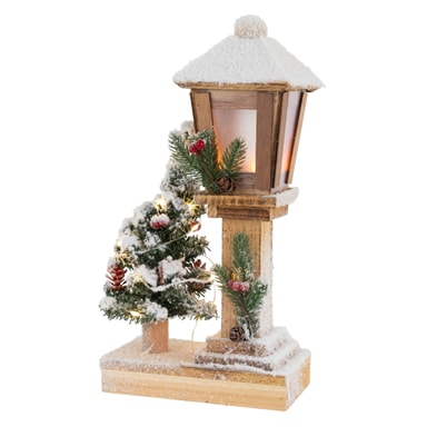 Varm hvid og hyggelig julepynt er et must ved juletid. Denne smukke snedækkede julelanterne står på en træfod ved siden af et pyntet juletræ, der er dækket af sne. Både lanternen og juletræet er udstyret med en varmhvid LED-lyskæde. De smukke lyskæder drives af 3 AA-batterier. Den indbyggede timer gør det muligt at tænde lyskæderne, når det allerede er mørkt udenfor. Lanternen og juletræet forbliver tændt i 6 timer og slukker derefter i 18 timer.