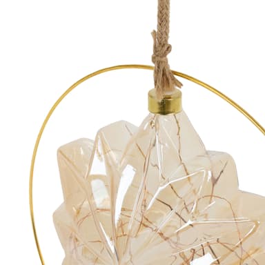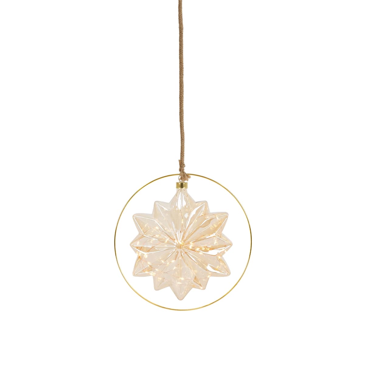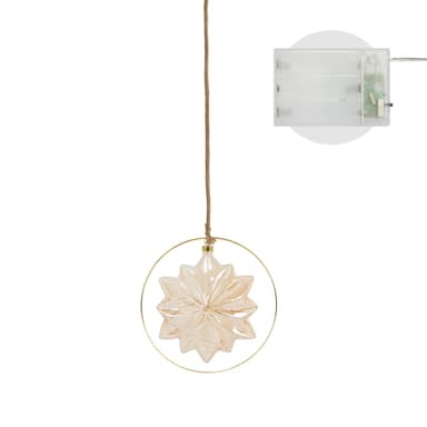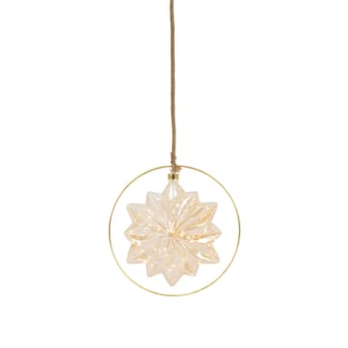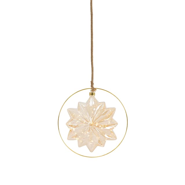 I en fin guldring fremstår denne julestjerne i et hyggeligt og magisk varmhvidt skær. En varmhvid LED-lyskæde er placeret i den let overskyede glasstjerne og oplyser kroppen. Den lette uklarhed får lyskæderne til at se fantastiske ud og giver dit juletræ et beroligende varmhvidt skær.