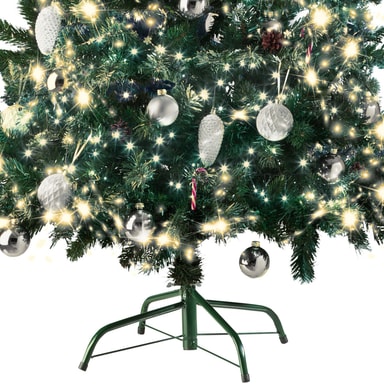 Det tætte nåleklæde i dyb grøn farve giver sammen med koglerne et særdeles realistisk udseende. De bøjelige grene kan formes efter ønske, og de mange hundrede spidser er kunstfærdigt sneet for det særlige touch. Resultatet er et forbløffende ægte juletræslook, der udstråler atmosfæren af en vinterskov. Den robuste, pulverlakerede foldbare metalfod med skridsikre gulvbeskyttere sikrer altid en stabil stand – selv ved rigelig dekoration.