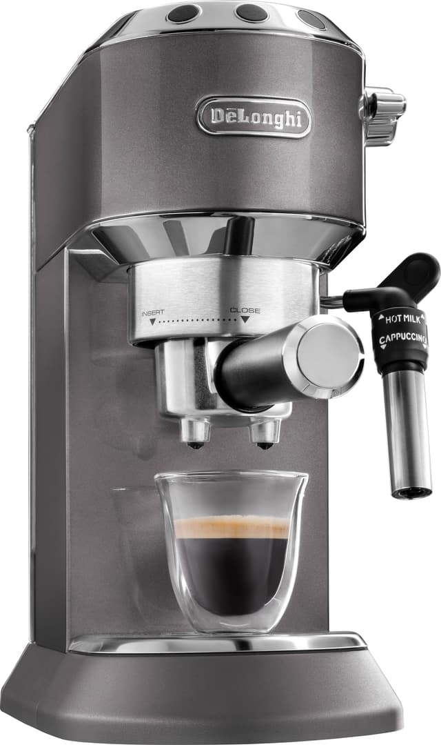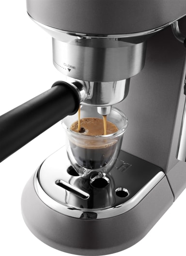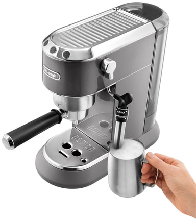 Forkæl dig selv med en aromatisk espresso eller skummet cappuccino, der vil smage som dem, du køber på caféen takket være DeLonghi Dedica espressomaskine EC785GY med justerbart cappuccino-system, to drypbakker, et exceptionelt design og en høj ydeevne.