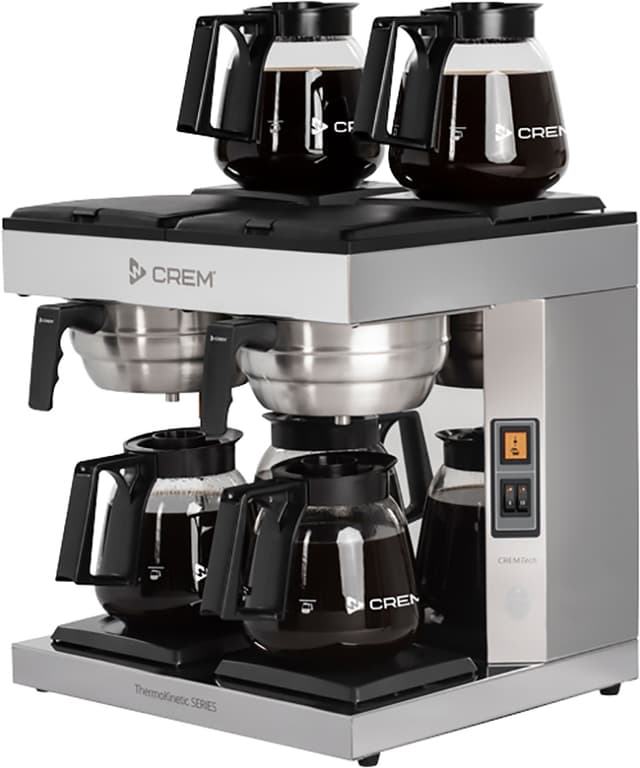 Denne Crem ThermoKinetic DM4-4 kaffemaskine er designet til travle kontorer og er forsynet med manuel vandpåfyldning samt 2 bryggepladser og 2 varmeplader på toppen, som holder kaffen varm. Den er desuden udstyret med en alarmog en digital skærm, som giver besked, når kaffen er klar. Kaffen brygges gennem låget ned i de 2 1,8 liter glaskarafler, som kan bruges til servering.