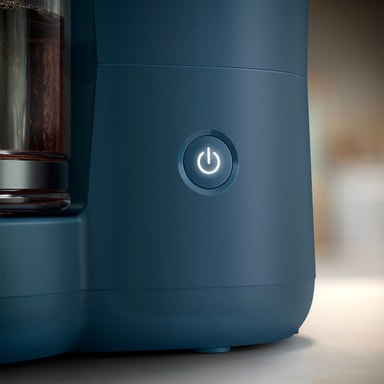 Denne holdbare kaffemaskine har et elegant blåt ydre og en glaskande. Den har brugervenlige knapper til betjening og er designet til at passe elegant ind på dit køkkenbord.