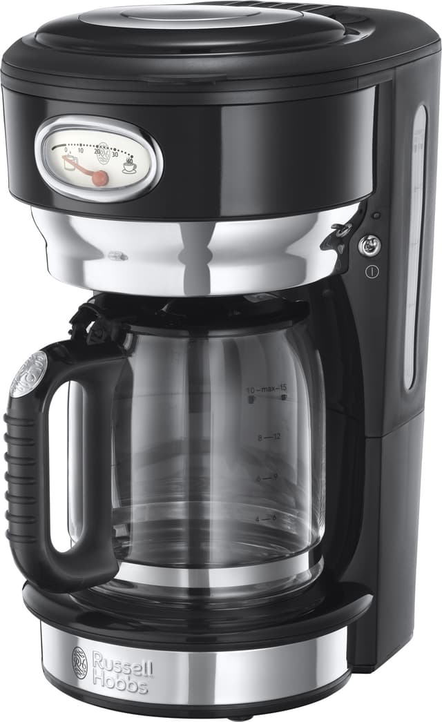 Med Russell Hobbs Retro kaffemaskinen kan du tilberede en hel kande kaffe til at få dig igennem din morgen. Kaffemaskinens design er inspireret af vintage maskiner fra 1950erne og har en praktisk bryggestatusmåler, så du kan følge med i bryggeprocessen og den resterende holde-varm tid. Der medfølger en elegant glaskaraffel med 1,25 liters kapacitet, hvilket svarer til 10 kopper kaffe.