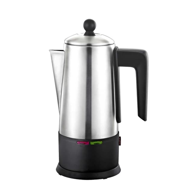 Kaffeperkolator 4 til 12 kopper nyd god kaffe brygget med enperkolator. Med ergonomisk designet håndtag til nem hældning. Med indikatorlys der viser brygnings- eller vedligeholdelsesvarme. Når brygningen er færdig lyser den røde indikatorlampe for at signalere at din kaffe er klar. Derefter skifter perkolatoren automatisk til vedligeholdelsesvarme, på kun 50w. Bryggeren slukker automatisk efter ca. 40 minutter efter brygning. Med en base der ikke bliver varm. Dette forhindrer varmeskader på borde og diske. Ingenbehov forunderlag eller anden overflade beskyttelse. Specifikation: 220-240v, 50 / 60hz, 900-1100w.
