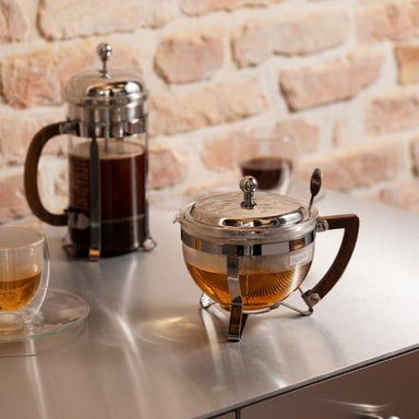 CHAMBORD glastekanden med filter er omhyllet af en stilfuld rustfri stålramme med et ergonomisk plastikhåndtag, som giver nem hældning og er ideel til at lave grøn, sort eller hvid te og med urteteer. Den vil uden tvivl få dig til at føle dig ekstra særlig.
