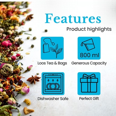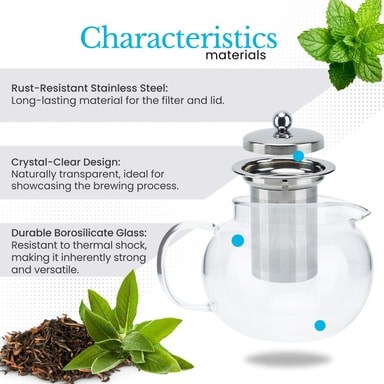 - Robust borosilikatglas - Solid, tynd bærehank - Med låg af metal - Kapacitet på 800 ml - Pladsbesparende design