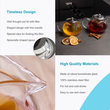 Denne elegante tekande har sit moderne design. Vandkanden har en kapacitet på 650ml eller 800ml. Fremstillet af borosilikatglas af høj kvalitet. Ideel til varme og kolde drikkeLæs mere om produktet