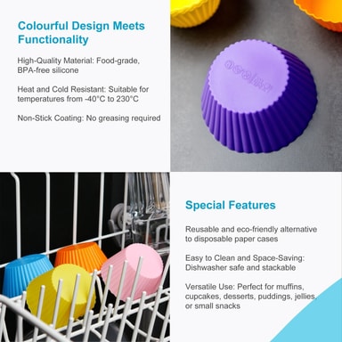 Muffinsformene er velegnede til brug ved temperaturer fra -40 til 230 °C og kan bruges sammen med gryder, ovne, mikroovne, køleskabe og dampkogere. De kan genbruges, fordi de er nemme at vaske op, og de er ideelle til opbevaring af grøntsager, frugt og snacks. og snacks.