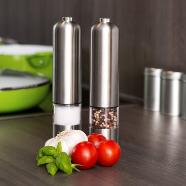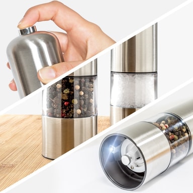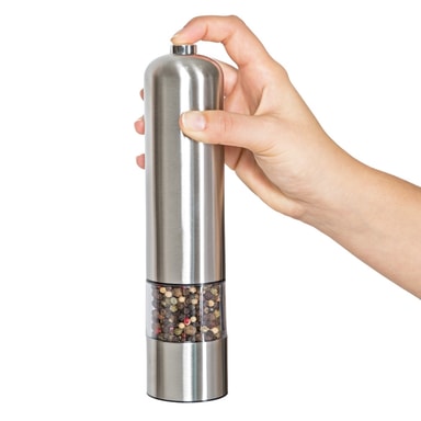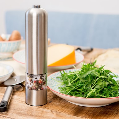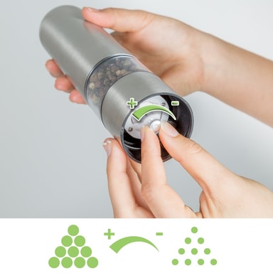 Denne smukke elektriske salt og peberkværn i rustfrit stål med keramisk kværn i høj kvalitet bekvemmeliggør tilsmagningen af dine retter. Den keramiske salt og peberkværn kan indstilles trinløst. Med lyset kan man se og skønne den rigtige mængde til krydringen af retten. En stilren salt og peberkværn, der er det perfekte tilbehør i enhver husstand.