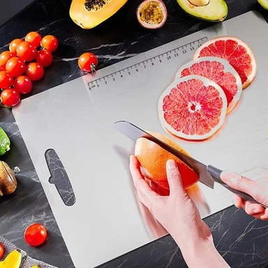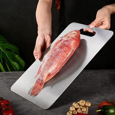 Dette skærebræt i rustfrit stål er det perfekte værktøj til både daglig og avanceret madlavning. Med sin holdbare konstruktion og moderne firkantede form giver det en glat overflade, der er ideel til at skære alt fra frugt og grøntsager til kød og brød. Det stilfulde håndtag gør det nemt at håndtere og praktisk at hænge op til opbevaring.