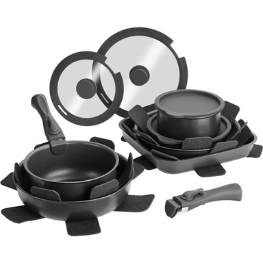 De aftagelige håndtag af varmebestandig bakelitplastik er et andet højdepunkt. Du kan frit montere dem på enhver af gryderne eller panderne, hvilket garanterer dig en fleksibel anvendelse og især en enorm pladsbesparelse, både ved opbevaring i skabet og ved indretning i opvaskemaskinen. For at beskytte non-stick belægningerne mod ridser og skader inkluderer sættet også 5 pandebeskyttere, som nemt kan lægges imellem ved stabling.