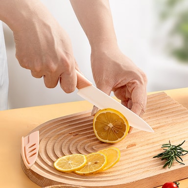 Denne keramiske frugtkniv på 15 cm kombinerer funktionalitet med stil. Det skarpe keramiske blad sikrer nem skæring af frugt, grøntsager og meget mere. Det ergonomiske lyserøde håndtag giver et behageligt greb, mens det rustfri og pletbestandige b...Læs mere om produktet