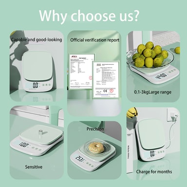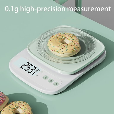 Högprecisionssensor: Utrustad med en uppgraderad högprecisionssensor ger denna köksvåg exakta mätningar från 0,1 g till 3 kg. Perfekt för bakning, matlagning och portionskontroll, vilket säkerställer att dina recept alltid är perfekta. De exakta mätningarna hjälper dig att uppnå konsekventa resultat varje gång, oavsett om du mäter kryddor, vätskor eller fasta ämnen. Dess noggrannhet gör den till ett oumbärligt verktyg för både amatörkockar och professionella kockar.