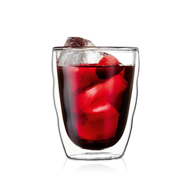 BODUMs dobbeltvæggede, termoglas er mundblæste. Der er skabt i borosilikatglas, som er så varmebestandigt, at glassene både kan gå i ovnen, mikrobølgeovnen og i fryseren, uden at der går skår i glæderne. Dobbeltvæggen fungerer som isolering, så varmt forbliver varmt, uden at du brænder fingrene. Samtidigt forbliver kolde drikkevarer kolde, uden at der dannes ringe af kondensvand på bordet.