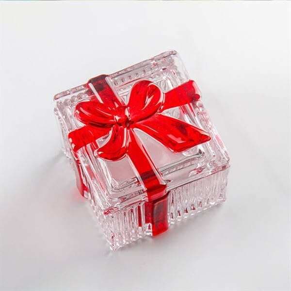 Fremstillet af glas med en dekorativ rød sløjfe på låget