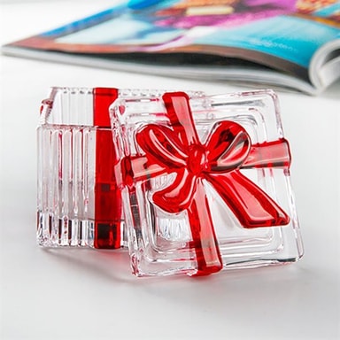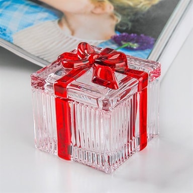 Specifikationer - Materiale: Glas - Form: Firkantet - Størrelse: 6,5 x 6,5 cm - Vægt: 317 g - Farve: Klar med rød sløjfe