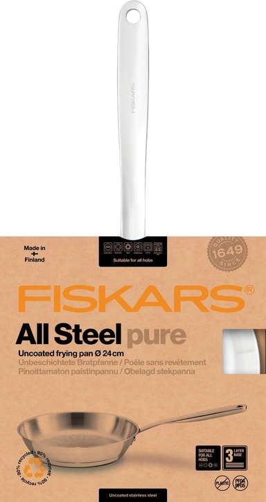 Fiskars All Steel Pure stegepanden 24 cm leverer jævn varmefordeling og langvarig holdbarhed. Med ovnfast alsidighed op til 270°C og 3-lags bund er det køkkenudstyr, du kan stole på.Læs mere om produktet
