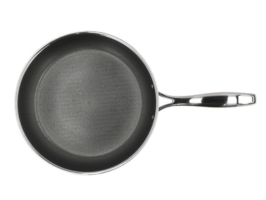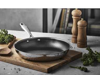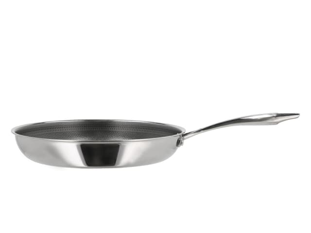 Stegepande, 28 cm. Paillon Hybrid-serien fra Pillivuyt Gourmet er fremstillet i 3-ply rustfrit stål, som er en konstruktion af to lag rustfrit stål med et aluminiumlag imellem. Det betyder, at varmen fordeles hurtigt og fastholdes jævnt. Takket være den indvendige keramiske hybridbelægning får du en slidstærk overflade med en effektiv non-stick-effekt. Det forhøjede mønster i rustfrit stål beskytter bunden, mens den keramiske topbelægning sikrer, at maden ikke brænder fast. Kort fortalt: • Fremstillet i 3-ply rustfrit stål • Keramisk hybridbelægning på indersiden • Poleret rustfrit stål på ydersiden • Velegnet til alle varmekilder – også induktion • Tåler alle redskaber, men vi anbefaler træ, plast eller silikone • Tåler ovn op til 240 °C (gryder dog uden låg) • Håndopvask anbefales • Produceret uden PFAS