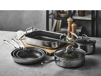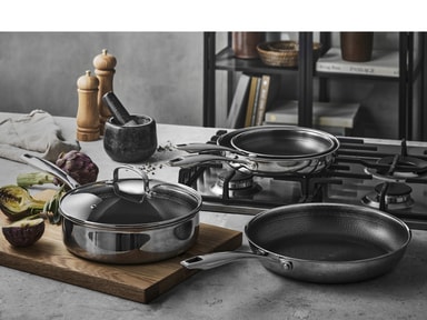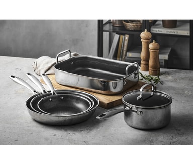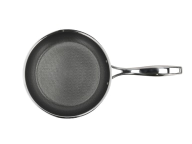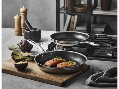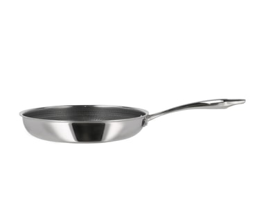 Stegepande, 24 cm. Paillon Hybrid-serien fra Pillivuyt Gourmet er fremstillet i 3-ply rustfrit stål, som er en konstruktion af to lag rustfrit stål med et aluminiumlag imellem. Det betyder, at varmen fordeles hurtigt og fastholdes jævnt. Takket være den indvendige keramiske hybridbelægning får du en slidstærk overflade med en effektiv non-stick-effekt. Det forhøjede mønster i rustfrit stål beskytter bunden, mens den keramiske topbelægning sikrer, at maden ikke brænder fast. Kort fortalt: • Fremstillet i 3-ply rustfrit stål • Keramisk hybridbelægning på indersiden • Poleret rustfrit stål på ydersiden • Velegnet til alle varmekilder – også induktion • Tåler alle redskaber, men vi anbefaler træ, plast eller silikone • Tåler ovn op til 240 °C (gryder dog uden låg) • Håndopvask anbefales • Produceret uden PFAS