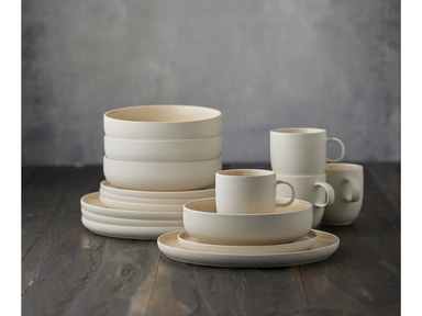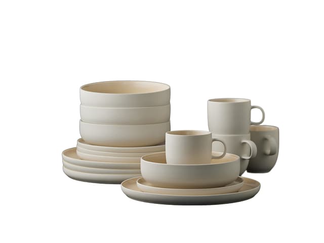Dette sæt indeholder 4 middagstallerkener dia. 27 cm, 4 tallerkener dia. 21 cm, 4 skåle dia. 19 cm samt 4 krus 30 cl. Den reaktive glasur danner smukke mønstre, der minder om strukturer i den levende natur. Glaseringsteknikken hviler på traditionelt glasurhåndværk, og i denne proces skabes de uforudsigelige mønstre og overfladens forskellige nuancer. Grundfarven er mat hvid, og produkternes inderside har fået den smukke farve Sand, der er rolig og nordisk og signalerer rustik natur. Farven sand er et godt alternativ til den klassiske hvide og passer perfekt til en moderne indretningsstil med naturfarver og rustikke elementer. Sand skaber en rolig, afdæmpet og eksklusiv stemning og er flot i et klassisk, nordisk interiør med eksempelvis danske møbelklassikere og natursten som terrazzo og marmor. Sand er en neutral nuance, som passer godt sammen med alle andre farver.
