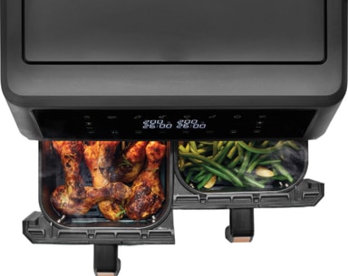 Design: Air fryeren har en kompakt matsort ramme med to 5,5l-kurve, der kan bruges samtidig. Hver kurv har sit eget håndtag for ekstra bekvemmelighed.