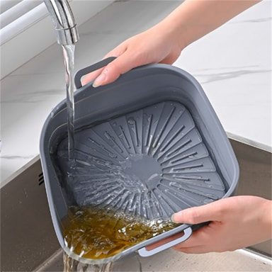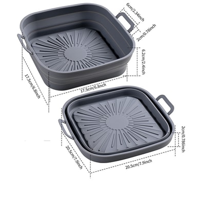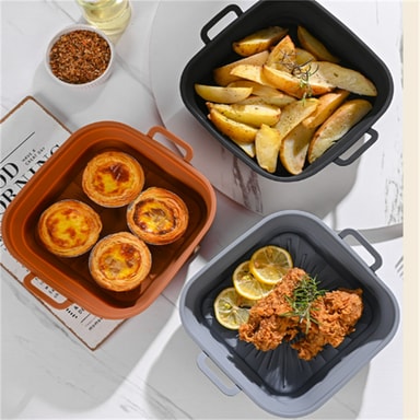 Firkantet form af fødevaregodkendt silikone. Den passer perfekt ind i frituregryden og forhindrer klistrede og fastbrændte madrester i din Air Fryer. Beholderen kan genbruges og maskinvaskes. Den hævede kant holder maden på plads og fanger krummer og overskydende fedt. Formen kan komprimeres, så den fylder mindre, når den ikke er i brug.