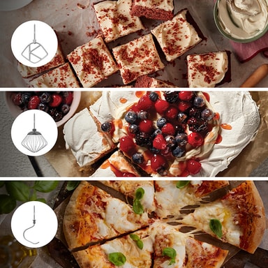 Denne MultiTasker maskine leveres med et omfattende sæt redskaber: en blender, foodprocessor, citruspresser, K-Beater, piskeris og dejkrog. Dette tilbehørssortiment giver dig mulighed for at blande, ælte, hakke, skære i skiver, rive, blende og presse juice med en enkelt maskine.