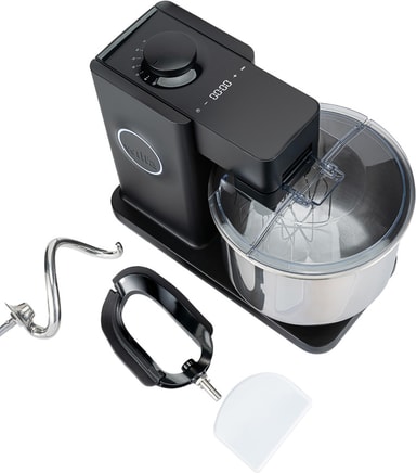 Den leveres med en dejkrog til æltning, en flexi-pisker til blanding og skrabning, en dobbelt ballonpisker til at tilføre luft til blandinger, et stænklåg til at reducere rod, og en dejskraber til nem håndtering og oprydning.