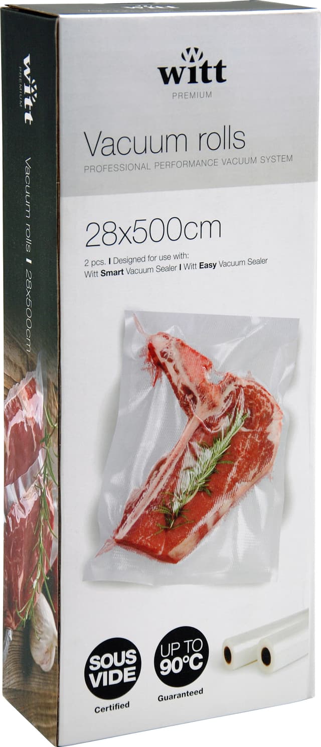 Hold din mad frisk i længere tid takket være disse Witt Premium vakuumforseglingsposer 62650005. Poserne er velegnede til opbevaring af mad og madlavning med sous vide-teknik. Pakken indeholder 2 store 28x500 cm poser.Læs mere om produktet