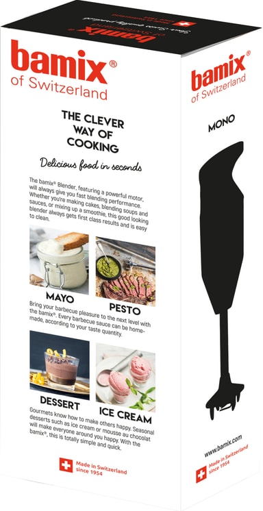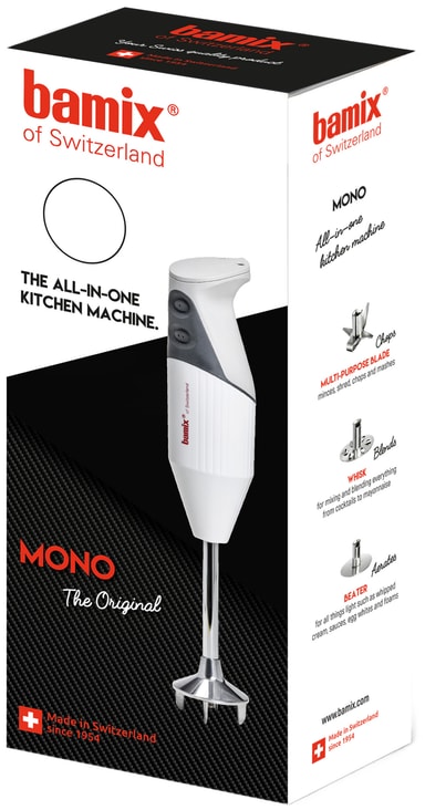 bamix® Mono-stavblender med en kraftig 200 watt motor, der sikrer pålidelig hjælp til selv de hårdeste opgaver i køkkenet. Stavblenderen har to hastighedsindstillinger, softgrip-sikkerhedsknap og en praktisk ledning, der giver masser af fleksibilitet. Til produktet medfølger multifunktionskniv, blenderskive, piskeskive, bæger med låg 600 ml og vægholder samt en instruktionsmanual. Livstidsgaranti på motor. Med din bamix® Mono og dens tilbehør kan du piske, purere, røre, blende, mikse, mose, knuse og hakke.Motoren er en kraftig vekselstrømsmotor, som samtidig er ekstremt støjsvag. Transmissionen med kniven er skruet direkte på motoren. Det betyder, at den indgående strøm omsættes direkte til kraftfuld effektivitet.Gode grunde til at vælge bamix®:• Klarer de fleste køkkenopgaver og kan bruges direkte i varme gryder• Trækker ingredienserne ind til bladet, sprøjter ikke og suger sig ikke fast til bunden af beholderen• De fire ben forhindrer beskadigelse af beholderens bund• Nem rengøring af selve maskinen – skal skylles under den varme vandhane. Tager ikke imod lugt eller farve.Download Bamix app'en og få inspiration til masser af gode opskrifter.