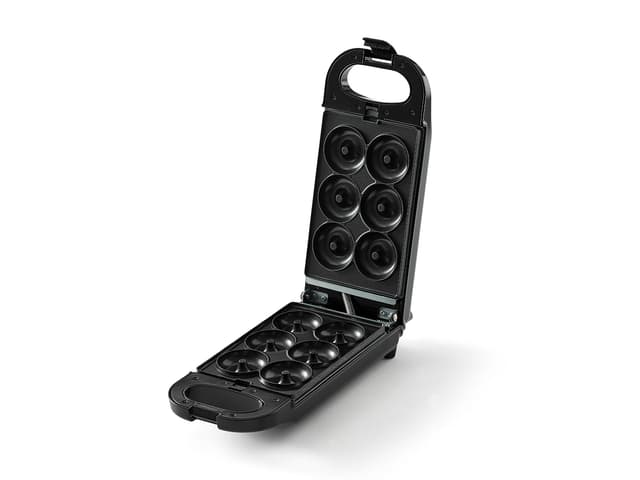 Elsker du donuts? Lav din egne små, lækre donuts – og slip fantasien løs, når der skal pyntes med farvet glasur, smeltet chokolade, vaniljesukker og andet velsmagende pynt. Lysindikator viser hvornår dejen kan hældes i. Der er plads til at lave seks donuts ad gangen, og donutmaskinen kan vendes rundt under bagningen for at fordele dejen bedre i maskinen, hvilket giver en mere ensartet afbagning. Maskinens plader er aftagelige og har non-stick belægning, som får dejen til at slippe ganske nemt og desuden gør rengøring lettere.
